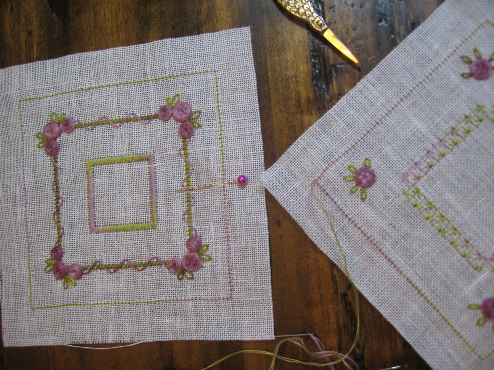 Sara conosce la mia passione per i ricami JJ e mi ha ricamato questo magnifico pinkeep su lino bianco, un filo su un filo, che ha accompagnato con due asciugamani americani, una piccola forbice (che non so perchè non ho fotografato) e sul retro ha creato con il fimo tre deliziosi bottoncini country.